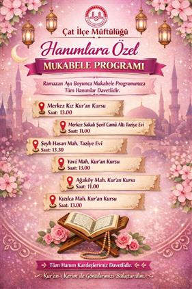 Çat İlçe Müftülüğümüz tarafından Ramazan ayı boyunca hanım kardeşlerimize yönelik mukabele programı düzenlenecektir.