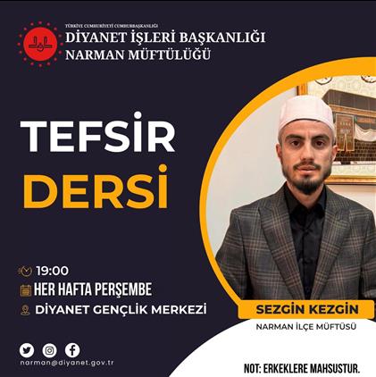 Müftülüğümüz Gençlik Merkezinde hafta perşembe günleri yatsı namazı sonrası erkeklere özel tefsir dersleri başlıyor. Tüm halkımız davetlidir.