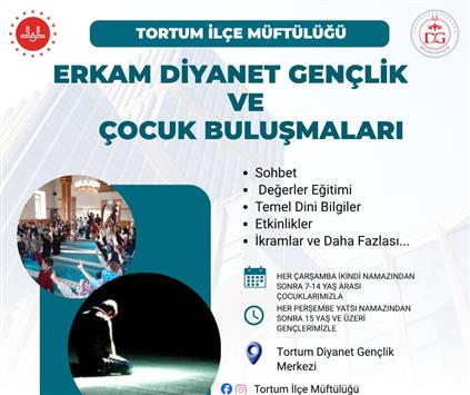 Tortum İlçe Müftülüğü Olarak, 7-14 Yaş Arası Çocuklarımız ile Her hafta Çarşamba Günleri; 15 Yaş ve Üzeri Gençlerimiz ile Her Hafta Perşembe Günleri Tortum Diyanet Gençlik Merkezinde Buluşuyoruz!