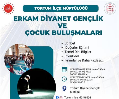 Tortum İlçe Müftülüğü Olarak, 7-14 Yaş Arası Çocuklarımız ile Her hafta Çarşamba Günleri; 15 Yaş ve Üzeri Gençlerimiz ile Her Hafta Perşembe Günleri Tortum Diyanet Gençlik Merkezinde Buluşuyoruz!