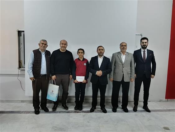 Hafta münasebetiyle ortaokullar arasında düzenlenen kompozisyon yazma yarışmasında üçüncü olan öğrencimize ödülünü takdim etti.